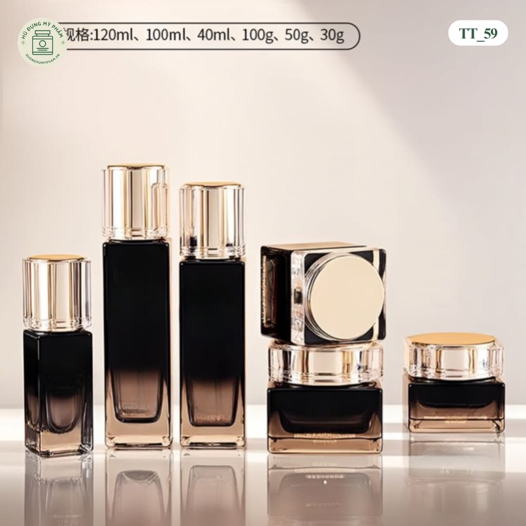 Bao bì khối vuông luôn mang lại cảm giác chắc chắn và cao cấp. Bộ chai lọ mỹ phẩm mã TT_59 sử dụng chất liệu thủy tinh đáy dày bền bỉ. Với tông màu đen ombre phối nắp vàng, mẫu bao bì này giúp nâng tầm giá trị cho thương hiệu của bạn.