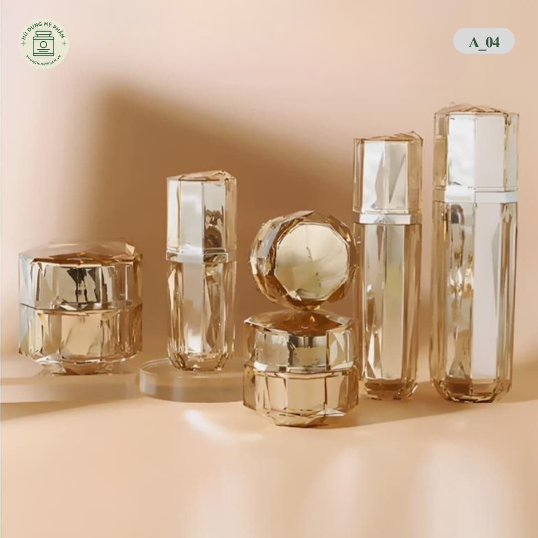 Bộ hũ chai Acrylic Kim Cương Vàng cao cấp mã A_04 với hiết kế vát cạnh kim cương bắt sáng, chất liệu Acrylic dày dặn giả thủy tinh, lõi PP an toàn.