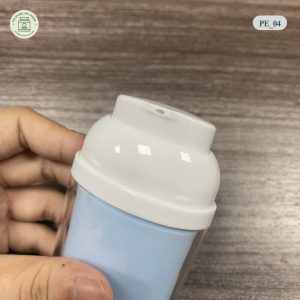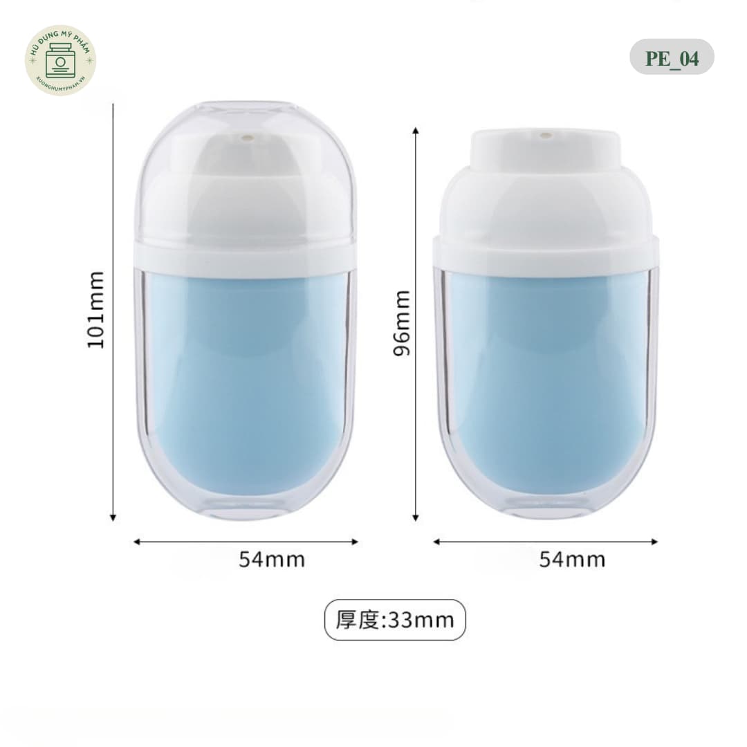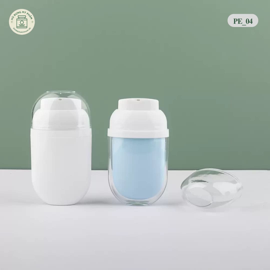 Mẫu chai PE_04 có thiết kế hình viên thuốc tròn trịa, cầm vừa tay. Vỏ ngoài trong suốt, lõi màu trắng (hoặc phun màu tùy ý). Đầu pump tiện lợi, phù hợp đựng kem chống nắng, kem nền, kem lót.