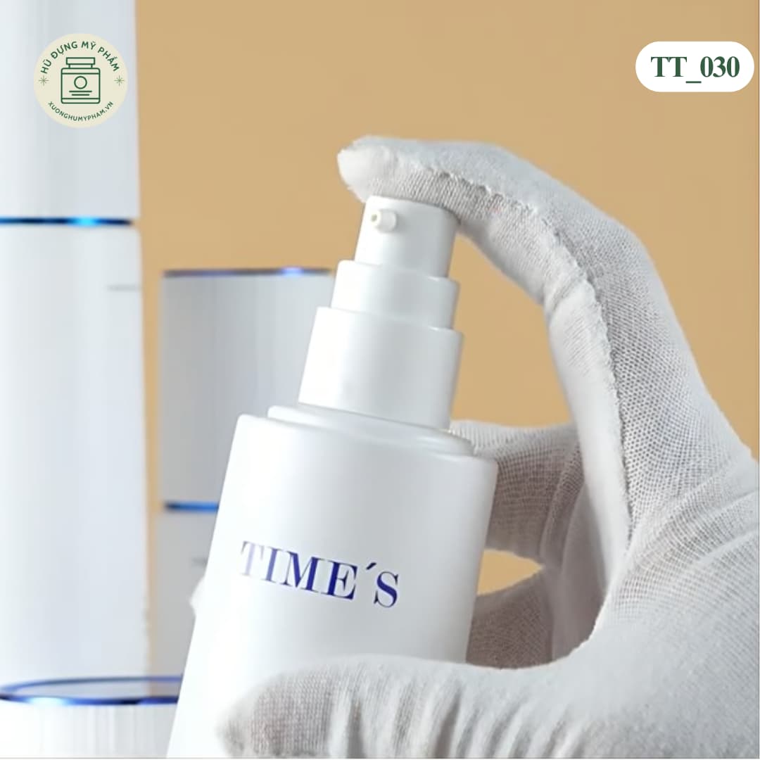 Mẫu chai TT_030 có màu trắng sứ sang trọng, tối giản. Thiết kế thân trụ tròn, nắp nhấn tiện lợi, thích hợp cho các dòng serum, sữa dưỡng hoặc kem lỏng cao cấp.
