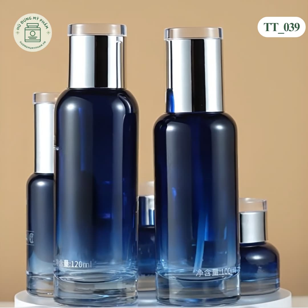 Mẫu chai TT_039 có màu xanh dương đậm đẹp mắt, làm từ thủy tinh dày. Thiết kế nắp nhấn tiện lợi, giúp bảo quản mỹ phẩm tốt hơn nhờ khả năng cản ánh sáng.