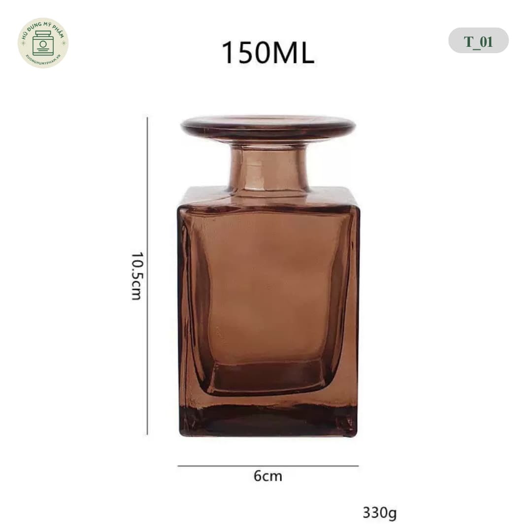 Mẫu chai T_01 sở hữu thiết kế “Đầu tròn – Đế vuông” kinh điển của dòng Reed Diffuser. Chất liệu thủy tinh dày dặn, đế đúc nguyên khối nặng tay, giúp chai đứng vững khi cắm que khuếch tán.
