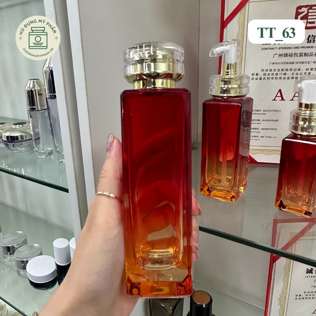 Mẫu TT_63 sở hữu thiết kế khối vuông hiện đại với chất liệu thủy tinh đáy dày bền bỉ. Thân chai phủ màu đỏ ombre chuyển sắc sang cam hổ phách độc đáo. Sản phẩm sử dụng nắp 2 lớp phối vàng kim sang trọng. Phù hợp cho các dòng serum, lotion hoặc toner phân khúc cao cấp.