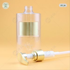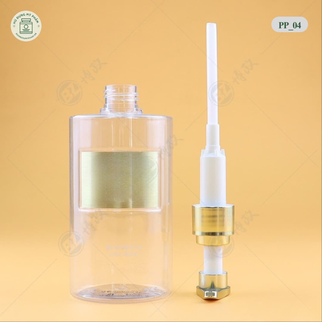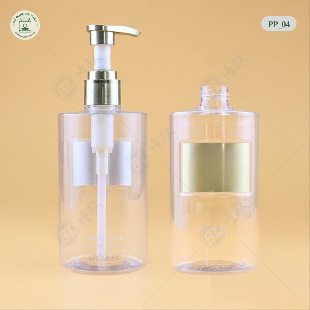 Chai nhựa đựng dầu gội trong suốt mã PP_04 (350ml). Cổ mạ kim loại cao cấp. Nhựa dày dặn như thủy tinh. In ấn logo giá gốc tận xưởng.