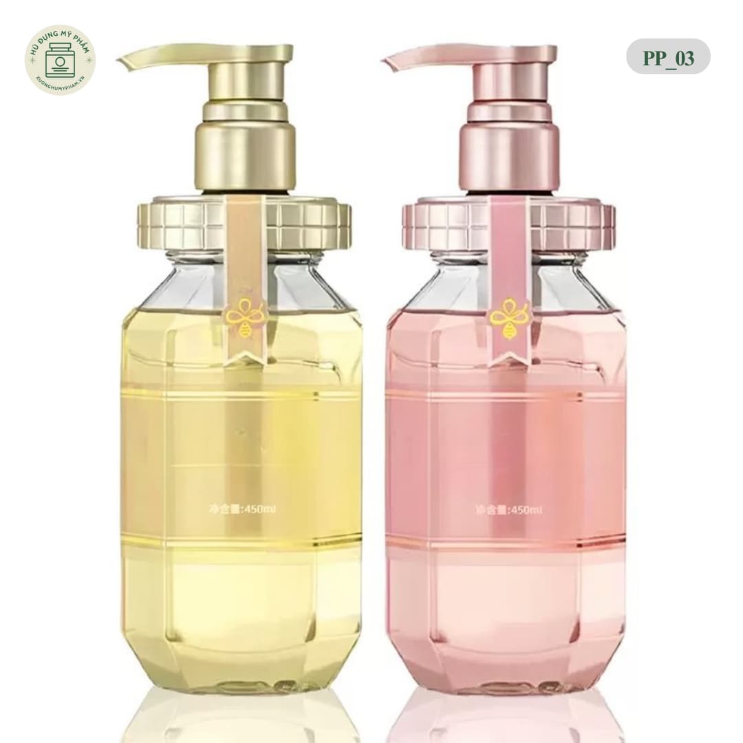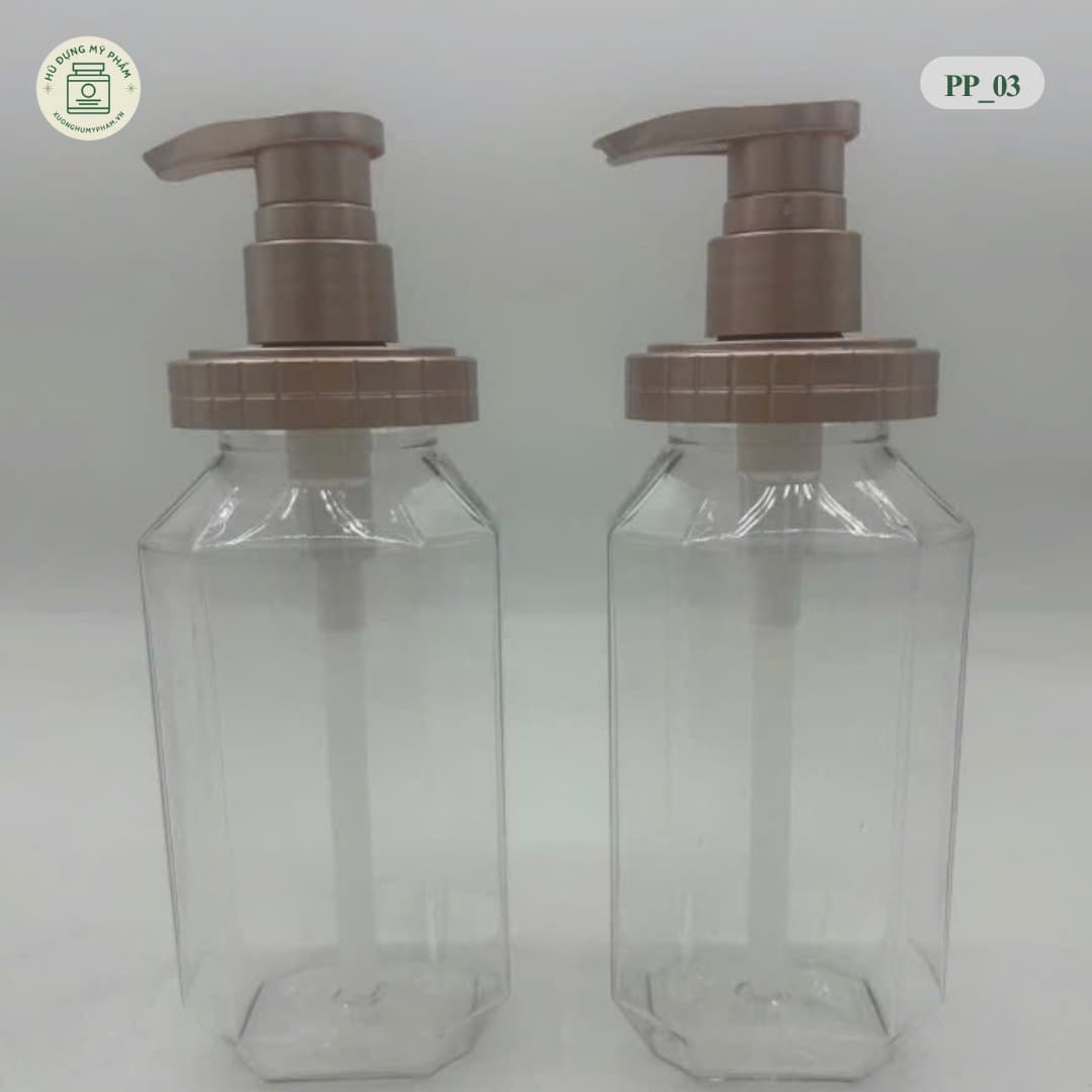 Mã PP_03 gây ấn tượng với thiết kế thân chai đa giác (dáng kim cương) trong suốt, kết hợp cổ chai mạ kim loại sang trọng. Dung tích lớn 450ml phù hợp cho các dòng Dầu gội, Dầu xả, Sữa tắm gia đình.