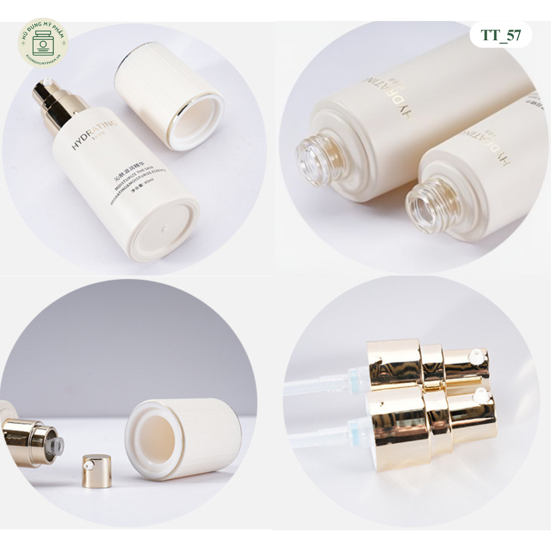 Mẫu TT_57 làm từ thủy tinh dày với lớp phủ trắng sứ mờ hiện đại. Điểm nhấn là nắp chai vân sọc dọc phối viền vàng kim cao cấp. Sản phẩm sử dụng đầu nhấn phun sương hoặc vòi pump. Phù hợp cho các dòng serum, lotion hoặc tinh chất dưỡng da.