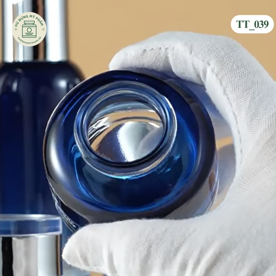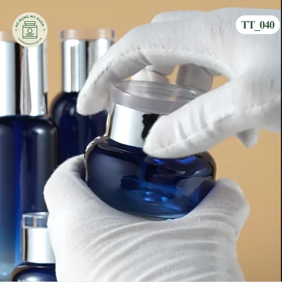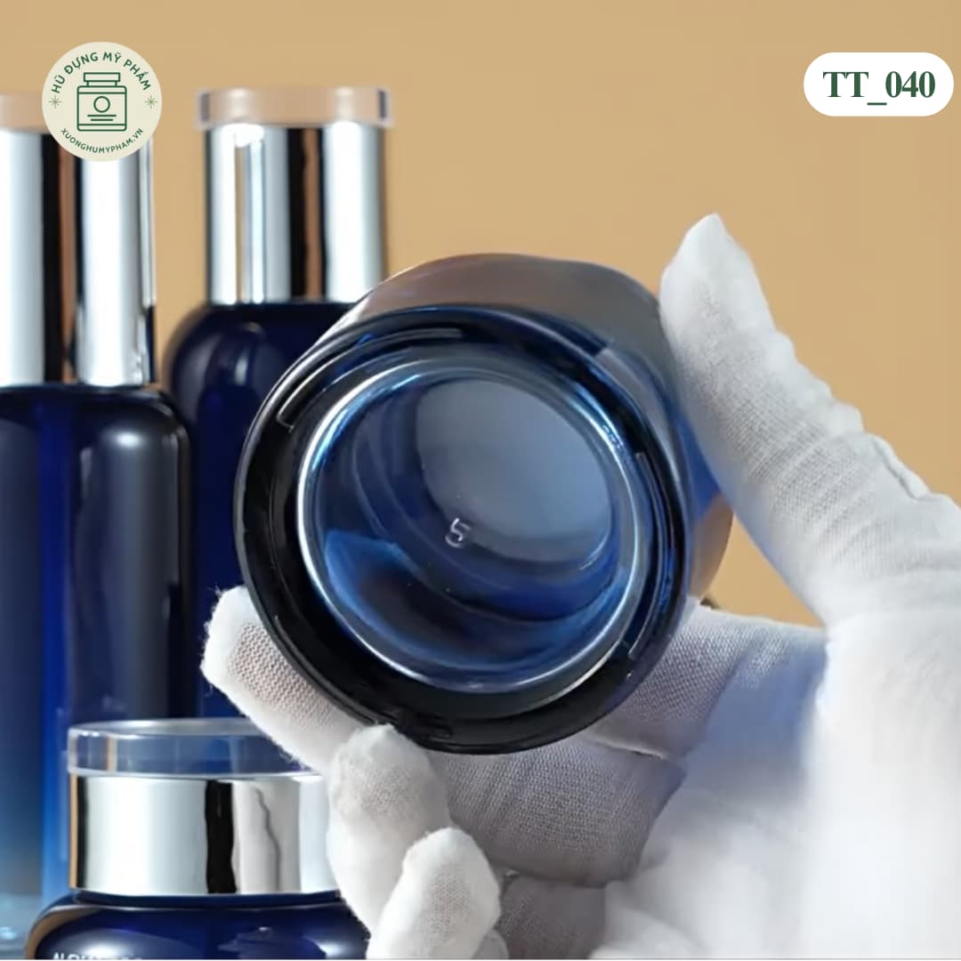 Mẫu hũ TT_040 có màu xanh dương đậm, vỏ thủy tinh dày dặn. Màu tối giúp bảo vệ kem khỏi ánh sáng tốt hơn. Đi kèm nắp mạ bạc sang trọng.