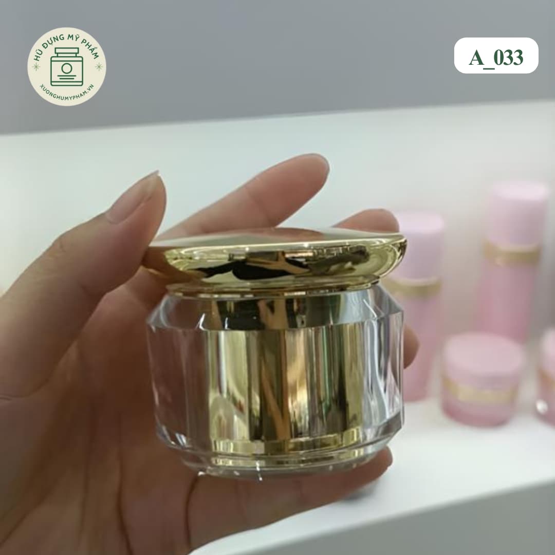Nếu bạn đang tìm kiếm một mẫu bao bì thật sự nổi bật và đẳng cấp cho dòng kem dưỡng cao cấp, mẫu hũ mỹ phẩm Acrylic mã A_033 là lựa chọn hoàn hảo. Với màu vàng kim rực rỡ và thiết kế vát cạnh độc đáo, sản phẩm này sẽ giúp thương hiệu của bạn thu hút khách hàng ngay từ cái nhìn đầu tiên.