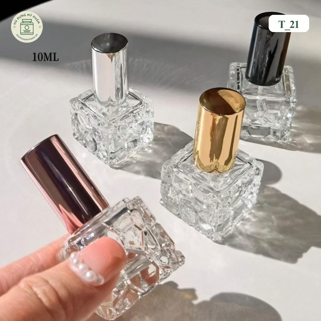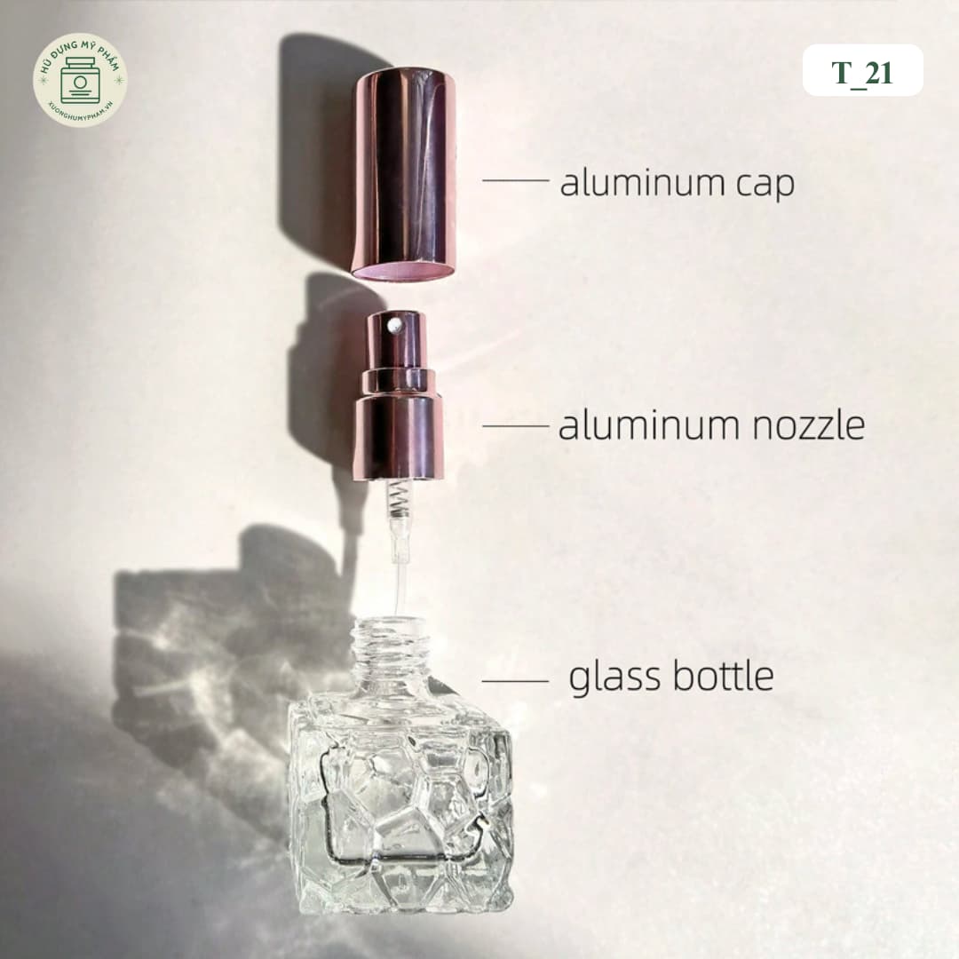 Chai chiết nước hoa T_21 sở hữu thiết kế thủy tinh trong suốt với đáy dày sang trọng, giúp tôn lên màu sắc nước hoa bên trong. Thân chai được dập họa tiết nổi tinh tế, tạo điểm nhấn thẩm mỹ và cảm giác cầm chắc tay. Kết hợp cùng đầu xịt phun sương mịn và nắp kim loại cao cấp, sản phẩm phù hợp cho các dòng nước hoa chiết, nước hoa mini hoặc xây dựng thương hiệu nước hoa riêng.