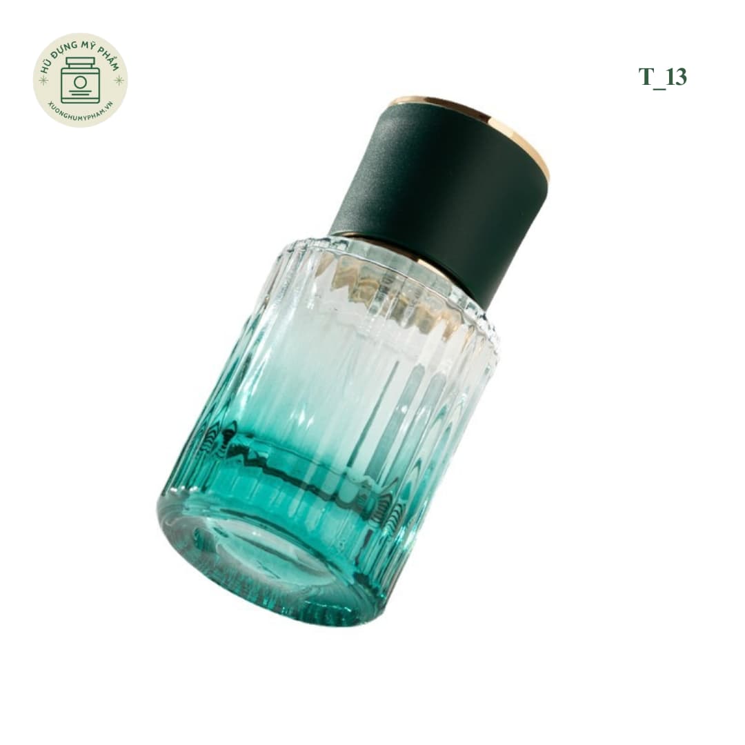 Mẫu T_13 làm từ thủy tinh dày với họa tiết vân dọc cổ điển. Thân chai nổi bật với màu xanh ngọc ombre hiện đại. Sản phẩm sử dụng đầu xịt phun sương mịn và nắp nhám mờ phối viền vàng sang trọng. Đây là mẫu bao bì lý tưởng cho các dòng nước hoa nam và nữ.